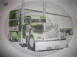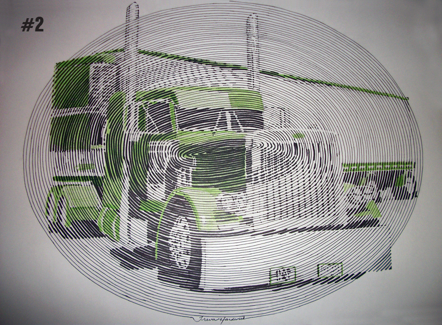 (Photo #2) Here is a different kind of truck drawing I recently did for Mickey Gwillim of Carlinville, IL. It is one of my “single line” spiral drawings. I start at a point near the middle of the picture (in this case it was at the side of the hood near the top of the grill), and then draw a spiral line out to the edge from there, in one continuous unbroken line. Then, I go back and widen out the lines in specific areas to create the illusion of the truck from a distance. These types of drawings take a long time to complete because of their complexity. I first drew this one in black ink and then followed up with light green colored pencil to shade in some color. These types of drawings are always a challenge (I have done several of them), but I like how they turn out. I can’t wait to hear what Mickey thinks of it. I hope he likes it!