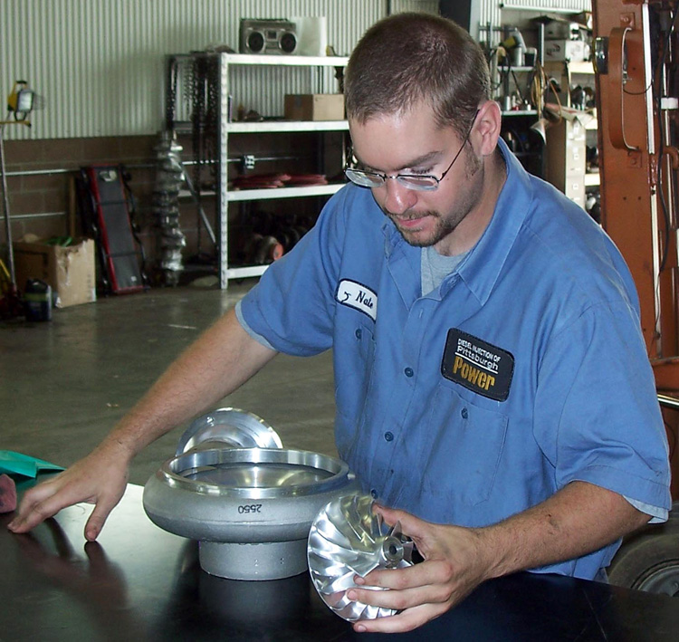 A properly tuned Caterpillar engine is a phenomenal piece of equipment when being supplied air from a Holset turbo. If you look at one of the pictures on this page, you’ll see Nate holding a polished compressor wheel from a Holset turbo. Back in 1992 we built a 1,200 horsepower Cummins for Ken Howard in England for road racing. With all that power and just a single turbocharger, the compressor wheel would often hand grenade before the race was over. Keep in mind that in road racing, with right hand and left hand turns, the driver is NOT driving like he has an egg between his right foot and the throttle, he is mashing the motor. We had to change the structure of the aluminum compressor wheel to make it stronger, which was accomplished by polishing and honing.