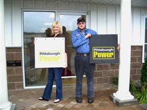 If you wanna be cool, you gotta be smooth! And remember, “There’s no rush like a performance diesel rush.” One final note, Pittsburgh Power mud flaps are now available. The lady holding the white flap in the picture is Aimee – she answers our phones and does all of the secretarial work at Pittsburgh Power – and that is Bubba beside her – he loves working on Dodge Cummins-powered pickups. If you have any comments or questions, please send me an e-mail to bruce@pittsburghpower.com or call me at Pittsburgh Power in Saxonburg, PA at (724) 360-4080.