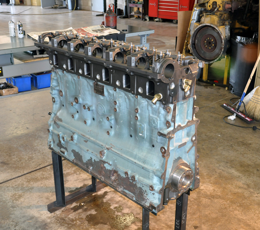 Once the valves and injectors are set and adjusted, oil is added and pressurized through the engine. The coolant is then put into the radiator, along with a new water filter and some Fleetguard DCA (an additive that prevents corrosion and electrolysis). Once the engine is started for the first time, we idle it for a few minutes, check for any miss, and then reset the valves and injectors. After that, the engine is painted. Then, finally, we road test the newly-rebuilt engine.