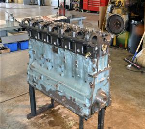 For an out-of-chassis rebuild, everything that is done during an in-chassis rebuild is done, with the addition of removing the crankshaft from the block and taking the engine to a machine shop for additional work. The crankshaft is straightened, polished and magnafluxed for cracks. Most crankshafts are bent about .020 to .025 when they have 750,000 or more miles on them. The engine block is also hot tanked and then magnafluxed. The crankshaft bore is honed straight and the head gasket surface is machined to make it smooth and flat, to better hold the head gasket. Also, the connecting rods are magnafluxed and reconditioned on the crankshaft end, and new bushings are installed in the wrist pin bore. Then, the distance from the center of the crank end to the center of the wrist pin bore is measured and the wrist pin bore is machined to hold the center line distance. The connecting rod is also balanced and checked for twisting.