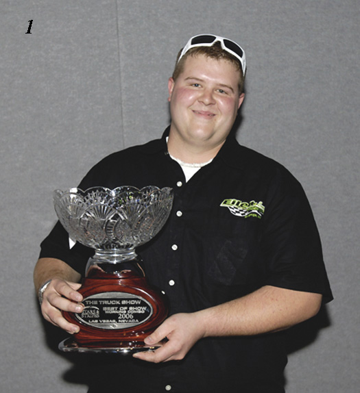 PAINT/GRAPHICS OR MURAL (COMBO): 1st Pat Eilen of Hampton, MN (Iron Outlaw); 2nd Mike Penrod of Fargo, ND (Running Wild); 3rd Paul Stanchio/PMP Trucking, Inc. of Port Washington, NY (Hot Wheels). ENGINE: 1st Ronnie Johnson/Witte Bros. Exchange of Troy, MO (Centsless); 2nd Wayne Baker of Taylor Ridge, IL; 3rd LeRoy McRoberts of Homer, NE. MOST HEAD-TURNING USE OF CHROME: Paul Stanchio/PMP Trucking, Inc. of Port Washington, NY – 2005 Blue Peterbilt 379 & 2005 Boydstun Car Carrier (Hot Wheels). BEST THEME: Pat Eilen of Hampton, MN – 2006 White & Lime Green Peterbilt 379 & 2006 Mac End Dump (Iron Outlaw). LIMITED MILEAGE (BOBTAIL): 1st Chuck Prigge/Sandvik Trucking of Valley Center, CA (Kaotic); 2nd Truett Novosad/Novosad Enterprises of Caldwell, TX (High Cotton); 3rd Bill Pierce of Poway, CA (Boss Hog); 4th Ray Myer/Speed Demon Truk Worx.