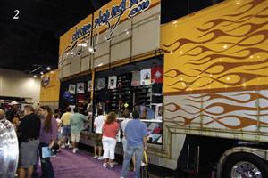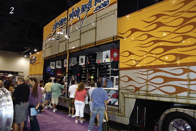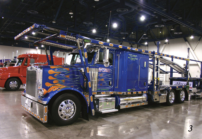 Out on the floor, a few members of the Chrome Shop Mafia were on hand to sell t-shirts and other stuff out of their newly-built display trailer. Pulled by CSM’s famed “Inferno” KW, the new trailer is painted to match and features a slide-up side door that reveals a vast display of CSM gear (photo 2). Look for this rolling store at most of the major truck shows this year. Just down the aisle from CSM was RJ Taylor’s Ol’ Blue USA Safety Center, offering free hourly seminars from the Nevada Highway Patrol and Nebraska State Patrol. These law enforcement officials answered questions regarding safety, hours of service, pre-trip and post-trip inspections and the latest laws. Also out on the floor, Panelite featured one of the largest displays, complete with several purple trucks “done up” with Panelite decorative chrome and stainless steel accessories. Another neat display was a Freightliner flatbed with a 9’ Steinway Concert Grand Piano and a full sound system mounted on the bed. Complete with cool vinyl graphics and lots of chrome, the “Piano Rig” was built by World Champion Pianist Ryan Ahern and is the only fully dedicated piano performance vehicle in the world. Throughout the show, Ryan performed world-class piano arrangements and award-winning Boogie-Woogie tunes.