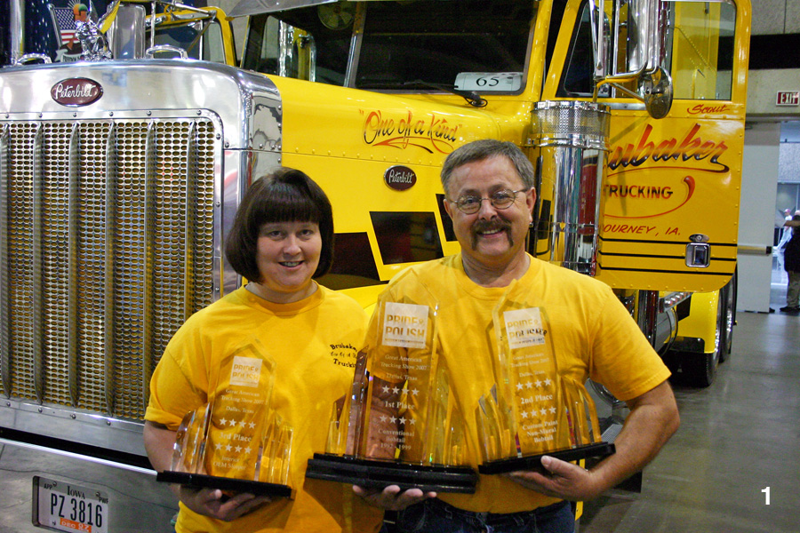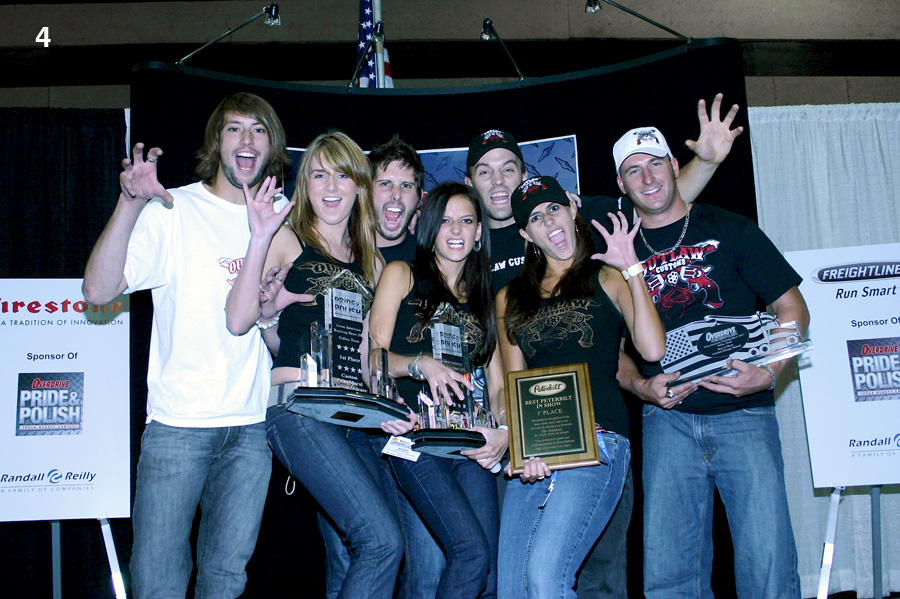 MOST TECHNOLOGICAL CAB (PRESENTED BY FIRESTONE): 1st Lynn & Shirley Baxter – 2006 FL; 2nd Harvey & Karen Zander – 2003 Int’l; 3rd Truett Novosad – 2001 Pete. PETERBILT COUNCIL OF CLASS (PRESENTED BY PETERBILT): 1st James Gobel – 2001 Pete; 2nd Sean McEndree – 2005 Pete; 3rd Phillip Clayton – 2005 Pete. INTERIOR (CAB ONLY): 1st Truett Novosad – 2001 Pete; 2nd Randy Supak – 2007 Pete; 3rd Brad Caton – 2007 Pete. OEM SLEEPER: 1st Bob & Shelly Brinker – 2000 FL; 2nd Harvey & Karen Zander – 2003 Int’l; 3rd Ron Brubaker – 1993 Pete. AFTERMARKET SLEEPER: 1st Lynn & Shirley Baxter – 2006 FL; 2nd Bob Greiner – 1997 Pete; 3rd David Kozar, Jr. – 1972 Pete. BOBTAIL PAINT (NON MURAL): 1st Steve Hendershot – 1985 KW; 2nd Ron Brubaker – 1993 Pete; 3rd Truett Novosad – 2001 Pete. BOBTAIL PAINT (MURAL): 1st Harvey & Karen Zander – 2003 Int’l; 2nd Bob & Shelly Brinker – 2000 FL; 3rd Sean McEndree – 2005 Pete. COMBO PAINT (NON MURAL): 1st Brad Caton – 2007 Pete; 2nd Vaughn Miller – 1995 Pete; 3rd Ted Dykes, Sr. – 1992 Pete. LIMITED MILEAGE PAINT (NON MURAL): 1st Keith Everett – 2007 Pete; 2nd Bobby Lindamood – 2007 Pete; 3rd Jake Lindamood – 2007 Pete.