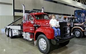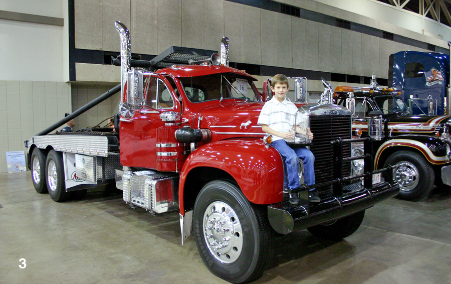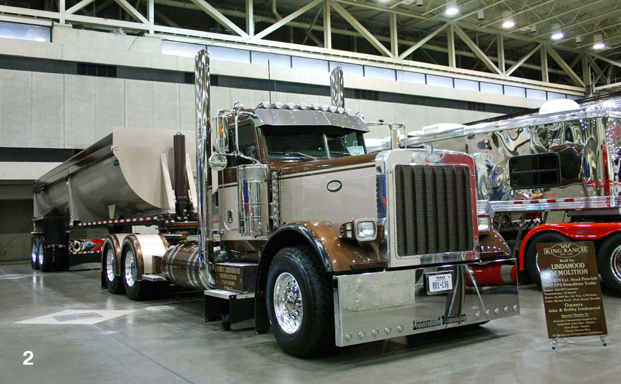 Over at the show trucks, there were a few that really stood out. Keith Everett’s “High Call” 379 Peterbilt Legacy featured bright red paint, a chopped roof, 10-inch pipes, custom motorcycle headlights and a super shiny polished trailer that was part luxury suite and part horse transporter. Keith’s rig took top honors in Best of Show Limited Mileage Combo and the Non Mural Paint class. Bobby Lindamood’s “King Ranch” Peterbilt and matching CPS Demolition Trailer (photo 2) not only looked great but also won a couple trophies, too. Ron Brubaker and his “One of a Kind” yellow Peterbilt, which he says is the only short hood Pete with a long hood front end in existence (he added three inches to the front end to remove the slope of the hood), took home three trophies (photo 1). Young Eric Hardage, at only 9 years old, took 2nd place in the Non Working Antique class with his 1963 Mack B-83 (photo 3). Eric’s dad Jeff didn’t do too bad either, winning two awards including Best of Show Combo. Many of the “usual suspects” did very well at GATS, including Harvey & Karen Zander (Icy Blu 2) and Bob & Shelly Brinker (The Legend of the Black Pearl). Collectively, these two took home seven 1st place and three 2nd place trophies, including Participant’s Choice and Best of Show Bobtail. But the truck that seemed to get the most attention was a new entry built by an energetic group of young people (photo 4) from Outlaw Customs in Colorado. Their rig “The Dead Man’s Hand” had several unique pieces including custom “twisted” mirror bracket bars and gear shifter, handmade headlight brackets and alligator skin seats. Brothers Alex and Andy Gobel, along with Nic Gillan, started with a smashed 2001 Pete with a bent frame and then rebuilt everything from the ground up. We are sure that you will be seeing more of this truck and hearing more about Outlaw Customs and their cool new products in the future. To learn more about Outlaw Customs and to see their truck, visit their website at www.outlawcustomshd.com.