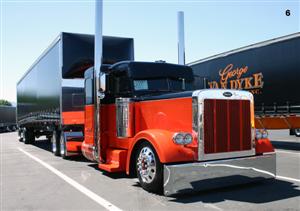 and Bob Cretton’s orange 1996 Peterbilt and black Western curtain van.