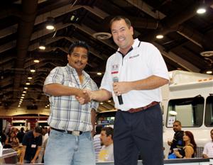 For the second year in a row, the show producers gave away a brand new Ford F150 pick-up to one very lucky attendee. Last year the giveaway was limited to just CDL holders, but this year it was opened up to anyone. The big “catch” of the giveaway is that you need to be present to win. They draw the winning name on Sunday afternoon, so anyone who signed up on Saturday had to return and anyone who entered on Sunday morning had to stick around until 3:00. And when the first name pulled was read, it was a woman who had already left for the day (I bet she will regret that decision). The second name pulled was Jose Figueroa of Chino, California. Not only was he in the crowd, but he was very excited as well.