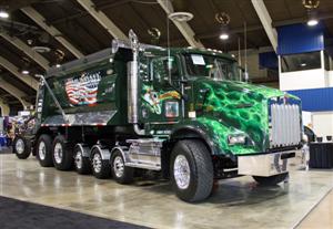ROADWORKS BEST USE OF CHROME OR STAINLESS: John Mundall of Mundall Trucking – 2009 Black & Green Flamed Kenworth T-800 Super Dump.