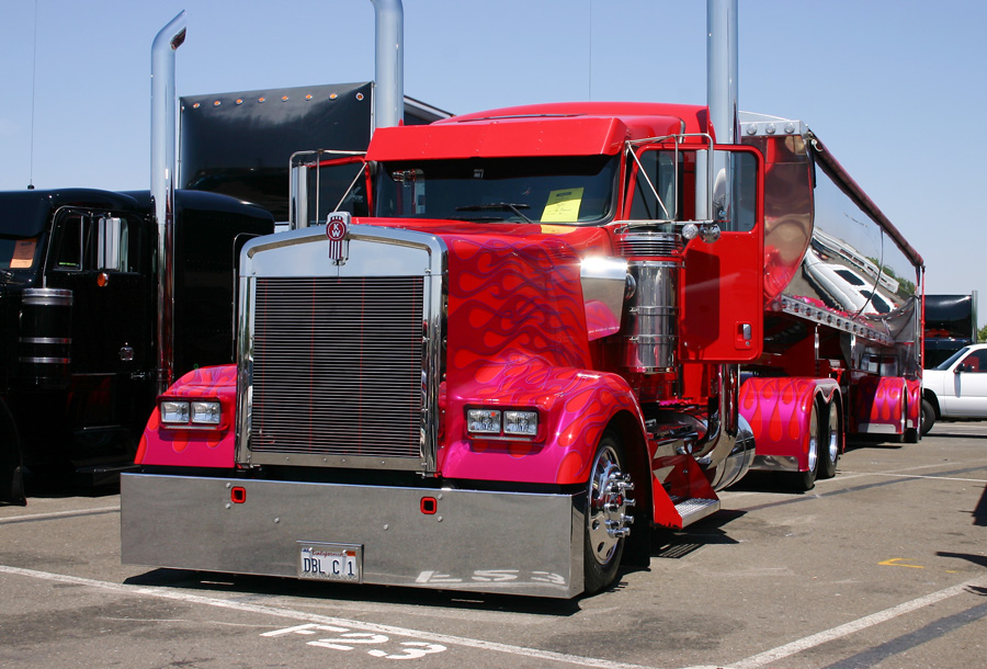 In the Combination class, 3rd Place went to Cory Cloward and his cool red KW and polished end dump (which was featured on our December 2007 cover); 2nd Place went to Jimmie Sernach and his blacked-out Peterbilt and curtain van; and 1st Place was awarded to James Davis and his orange and black 1993 Peterbilt and black curtain van (featured on our June 2008 cover). In addition to making our cover and winning 1st place at the show, it was also James’ 30th birthday that day – what a way to celebrate!