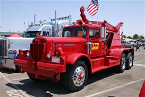 The show kicked off Friday night after everyone got settled and then the sun went down and the lights (on the trucks) came on. The glowing rigs were quite a display – especially Cory Cloward’s extremely lowered Kenworth and matching end dump. Featuring newly-painted magenta flames on the hood and unique billet air cleaner tops, Cory’s truck had a crowd around it all night (and the next day, too). A couple old trucks that got a lot of attention were a 1936 Autocar wrecker owned by Sal DiSalvo and a 1964 Peterbilt with a brand new Rogue Transfer unit owned by Mike Green of Yuma, AZ. Both of these rigs turned a lot of heads all weekend. Over at the Botelho camp, Jeff and his friends and family had several trucks on display, including his cool convertible and another Peterbilt project he recently completed.