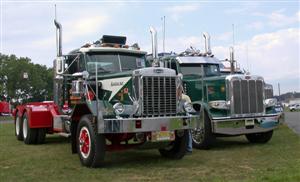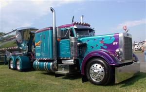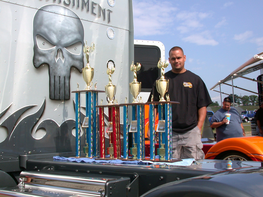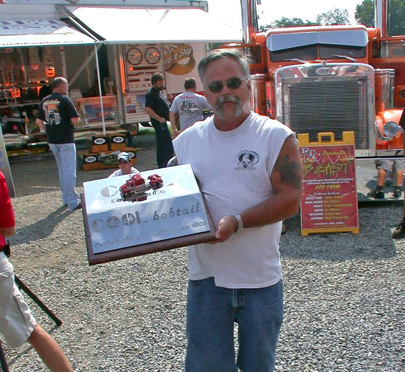 In addition to the usual show awards, Cool Truck Components, new-comers to the custom fiberglass fender market, presented two dynamite custom made trophies for “Cool Bobtail” and “Cool Combo” determined by people’s choice ballots. Paul Vanker took home the “Cool Bobtail” award for his 1996 Peterbilt 379, which is painted metallic teal green with nude sirens (girls) intertwined with purple flames rushing across the front and sides of the hood. The “Cool Combo” plaque went to Anthony Guida and Son’s latest addition to their cool fleet, a 2009 Kenworth W900 pulling a specially-designed trailer for hauling crushed cars, decked out in metallic gunmetal black paint and their signature silver pinstriped flames.