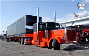 This year, the show fell directly on “10-4 Day” (October 4th), our one formal holiday and now annual excuse to have a party - and we took full advantage of that fact. Inviting several of our past cover trucks and their owners to join us in “10-4 Alley” near our booth, we were surrounded by friends and cool trucks - like Ron Kelsey’s 359 Pete, Hector Santos’ baby blue and white 2-axle Pete, and Mark Pounds’ purple-flamed Freightliner Classic. We were also proud to have Chris Hasty’s red and grey Pete 389 and matching tanker trailer, Ryan Hooten’s clean Peterbilt with matching hay trailers, and James Davis’ orange and black hot rod Pete and matching curtain van parked near our booth. Also nearby was the metallic green Peterbilt owned by the L.A. County Sheriff’s Department that was on our cover back in 2006 - this truck was hooked to a curtain van that was opened up and used as the stage for the awards. We’d like to thank all of these people for coming out and being part of our celebration.