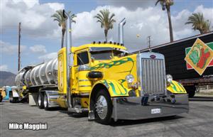 Of course, many of these folks were also given some hefty hardware to take home - especially Chris Hasty, who not only won the Best of Show trophy, but also the coveted People’s Choice award, too. Another big winner was Nick Mitchell of Michael Most Trucking - his yellow Freightliner covered with murals won 1st Place in its class, as well as Best Freightliner and Best Art Detail. The Best Peterbilt award went to Bob Doyle of Golden Bear, while the Best Kenworth award went to one of Nava Trucking’s clean KWs. Other notable winners included Steve Vermeer and his 1979 Pete 352 cabover hooked to a polished stainless tanker (our pick for the Sponsor’s Choice award) and Jeff Houts’ unique “outlaw-style” satin blue Peterbilt.
