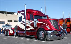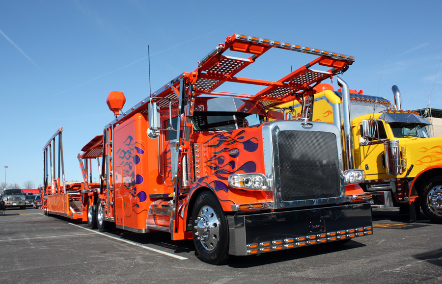 Out back, where the rest of the show trucks were competing, several stood out (see photos) including Homer Schultz’ 1993 blue Pete wrecker, Paul Stanchio’s new 2009 Pete 388 and 2009 Cottrell car carrier, painted bright orange with dark blue flames, and Marcel Pontbriand’s dark blue Pete and matching trailer covered with hand-painted murals and custom-made accessories. Also looking impressive was our cover truck (Dale Blevins’ custom 1942 Autocar shown by Cori Stuefen of Peterbilt of Joplin) and Jim Carello’s latest creation, a wild International LoneStar built by the crew at Elizabeth Truck Center in New Jersey. The People’s Choice winner of this year’s Big-Rig Build-Off went to Alex & Andy Gobel of Outlaw Customs for their Batman-looking Peterbilt, while the Industry’s Choice trophy was awarded to S & J Truck Sales for their “Big Red” Pete 359.