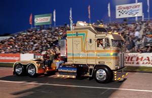 With an estimated crowd of 15,000 spectators, the show began with a parade of the winning trucks from the beauty competition. After that, a pair of 250-mph jet dragsters made a pass, and then two pairs of 300-mph jet funny cars went down the track. Then, Bob Motz’ jet-powered Kenworth took a roaring run down the track. Next, it was time for about ten of the country’s finest Monster trucks, including Maximum Destruction and Grave Digger, to entertain the crowd by smashing cars, doing donuts and making huge jumps. Then, it was time to race for the “King of the Hill” title. After several races, it came down to just two trucks. In the end, Brian Blair took the title (and the $5,000 cash), while runner-up Rick Reddick earned himself $1,000 for his efforts. After a few more jet cars went down the track, the show ended with “Benny the Bomb” blowing himself up – again!