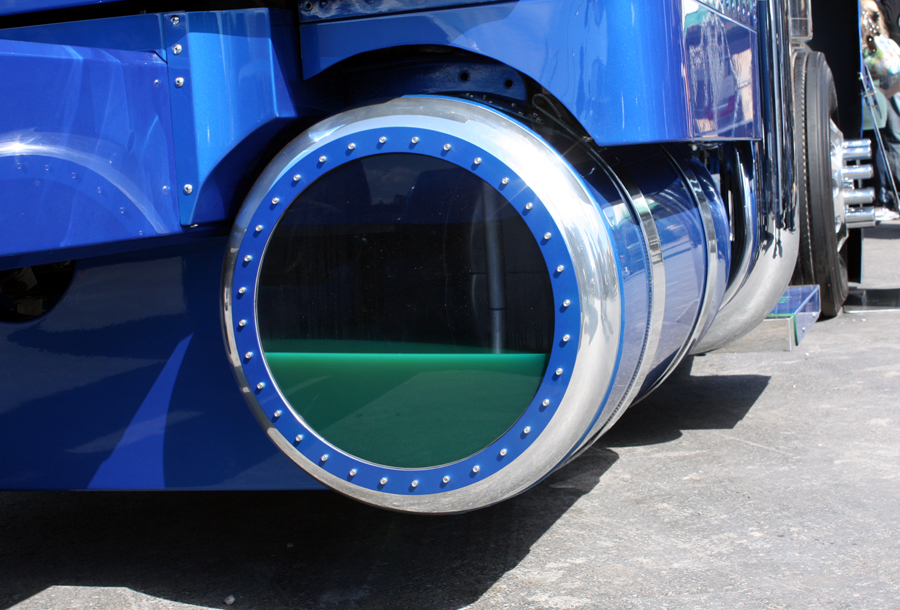 To try and mention all of the cool trucks that were at this show would be fruitless – it would take several more pages. Simply put, there was tons of incredible iron in JoMo that weekend. Looking at the pictures here, you can see some of our favorites, but the truck that got a lot of attention from the crowd was the latest “full build” from 4 State Trucks – a 1998 Peterbilt 379 called “Disorderly Conduct” owned by Paul Voight. This rig features a wild blue, black and green paint job, a custom Rockwood interior, a 359-style dash, a one-off rear frame cover with “openings” so you can see the painted and lettered driveline below, and something we had never seen before – “see thru” end caps on the fuel tanks! This truck turned a lot of heads.