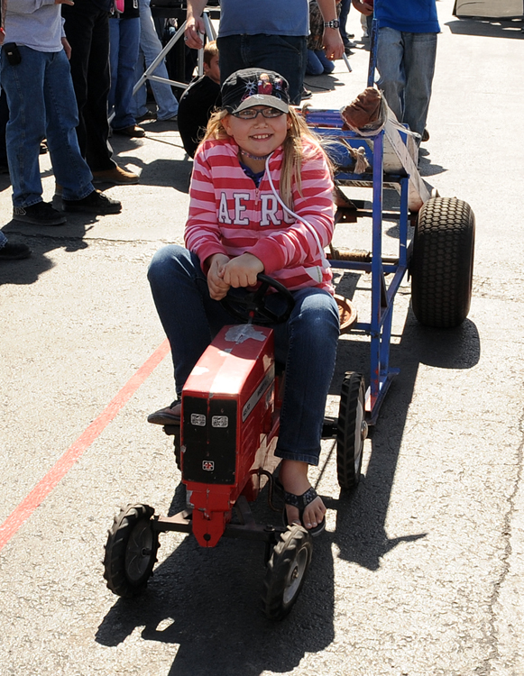 Saturday was jam-packed with activities, especially for the kids. At noon, the Kids Pedal Tractor Pull began. This event was a blast for both the kids that participated and the adults who watched and cheered them on. The Jasper County FFA ran the entire event. Using two small pedal tractors (a green John Deere and a red Massey Ferguson), boys and girls ages 6-12 took turns dragging a fairly sophisticated “sled” down a 50-foot course. The sled had a sliding weight that caused it to get heavier as the kids pulled it along (just like a real tractor pull). We did not get the names of all the winners, but in the girl’s 8-10 class, there was a real dogfight. Two young girls, Makayla Culver and Chelsea Harper, each completed two full pulls, but on their third try, Makayla finally went further than Chelsea and won the class. It was all pretty exciting and the crowd really got into it.
