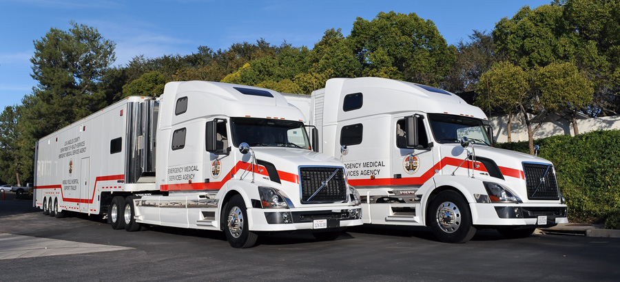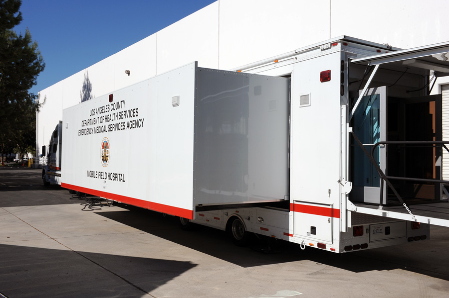 In this day in age, “Prepare for the worst, but hope for the best” is very good advice. Following those sage words, the Los Angeles County Health Department has taken preparedness to new heights to protect its citizens by purchasing two unique tractor-trailer combinations. Together, along with other emergency vehicles in their fleet, these two rigs make one high-tech mobile medical system. And although this system has never needed to be fully utilized, it is comforting to know that it is there, waiting and ready, if ever necessary.