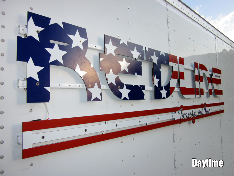 If you are looking for a new way to dress up your trailer, broaden your advertising hours, be more conspicuous at night, and maybe even win a few light shows, than we have the product for you – Logolights. Originally developed for his own trailer, Matt Meza got a lot of attention out on the road from the backlit logos he created and mounted on the sides of his trailer. After a lot of research and development (and several prototypes), Matt found an investor to help him start his company, which is now based in Valencia, CA. Since then, Matt has quit driving and now works with Logolights full-time, but his viper red Peterbilt 379 can still be seen running around Southern California promoting his company and its unique product. The signs, which are created to spec at Logolights facility and then shipped out as a kit for the customer to install, feature solid aluminum frames and brackets, long life LEDs, aluminum composite letters and stainless steel mounting hardware. There is no need to drill any extra holes in your trailer to mount the signs – just drill out some of the factory rivets and replace them with the high-strength rivets provided to mount the brackets. The brackets come with pre-drilled holes that line up with the existing rivet pattern on the trailer. The signs are lightweight, easy to clean, super durable, easy to install, and will add a new level of nighttime safety to your rig with the added visibility. The signs are very low profile and sit only one inch from the trailer (the company is currently doing wind tunnel testing to determine the product’s aerodynamics). Besides the added safety, Logolights also offer 24-hour advertising on your trailers, and a new, innovative look. Logolights will be on display at the truck show in Las Vegas in June, so be sure to check them out. For more information, visit www.lightmylogo.com or call them at (661) 295-1011.