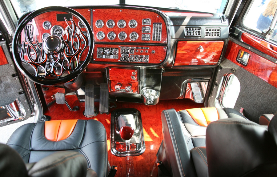 In addition to supplying the starter truck, Rockwood also provided most of the interior pieces, including the dash panels and floor. Some other donated items were tires from Firestone, side/tool boxes and a bumper from RoadWorks, aluminum rims from ALT Wheels, and 8” stacks from Lincoln Chrome. Other generous sponsors included 4-State Trucks, Outlaw Customs, Hush Mat, Qualitex Seats, Eaton, Lifetime Nut Covers, Air-Tech, Midwest Signtech, Road Skinz, Allstate Peterbilt, and Big Rig Chrome Shop.