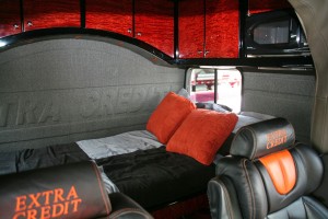 After stretching the frame, the kids installed the original FlexAir suspension and a driveshaft that was built at the school, then they installed a new fifth wheel, supplied by Fontaine. Next, they pulled the motor, cleaned it up and painted it. Pittsburgh Power enhanced the ECM and turned the 475 HP Cat into a 600. The sleeper was removed, gutted, chopped six inches, and then sent to the CCCC’s carpentry shop, where it was fitted with custom cabinets and upholstery.