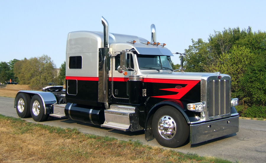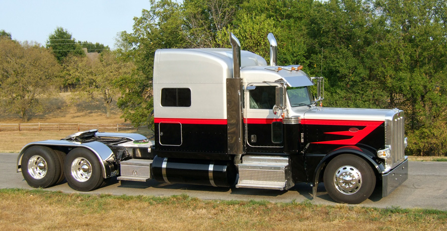 Once the truck arrived at the shop, the guys went to work, including two new recruits, James and Cody. Rick and Rob went to work on the paint, laying out a cool black and silver with a red stripe color scheme, while everybody else did their thing. The breathers were switched to old-style Peterbilt single-bolt breathers. Clint made the new breathers strapless, while his dad chopped the screens. Of course, they played the “hide urea tank” game, painted the tanks and the backs of the headlight pods, and installed a set of Hogebuilt stainless steel low rider full fenders on Clint’s hidden brackets. The finishing touches included a RoadWorks boltless drop visor and Fibertech cab and sleeper drop panels, made out of fiberglass, and trimmed down to fit. Randy could not have been happier with the cool truck that Chris ordered for him on his behalf.