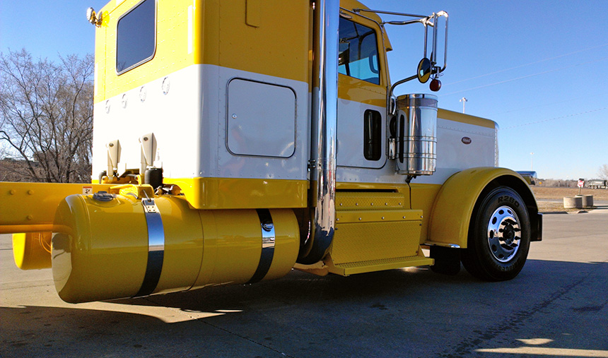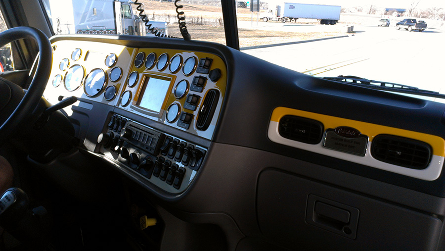 The new truck is a 2014 Peterbilt 389 with a 36” Unibilt sleeper and a “modest” wheelbase. Powered by a high-torque 550 Cummins hooked to an 18-speed transmission, the truck has a car-hauler front axle on air bags and features a bright yellow and white factory paint job. When the truck came in, Brad and his two sons came out to the dealership and spent a week with Clint and his crew, helping them finish the truck. It was like Hillbilly Customs was on tour and set up a temporary shop in Kansas City – and these guys were hard workers! Clint offered them a job, but they weren’t ready to leave sunny California.