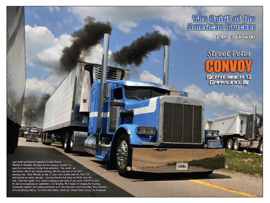 Last month we featured legendary trucker Dennis Mitchell of Blissfield, Michigan and his ongoing “mission” to save the true American Trucker from extinction. This month, we see Dennis’ efforts are already working, with this cool shot of his son’s amazing ride. Steve Mitchell, at only 27 years old, recently built this Pete 359 and became an owner operator – proving that the fruit does not fall far from the tree. Seen here gettin’ on it, Steve is hoping to see many of you at the CONVOY he and his dad are organizing on September 12 in Grayling, MI in hopes of bringing the trucking community together and raising awareness as to how important (and honorable) the profession of truck-driving really is. For more information, check out “Street Petes Convoy” on Facebook!