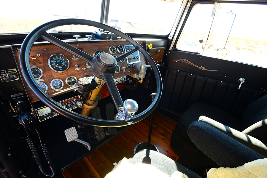 Moving to the truck’s interior, Three 7’s in St. George handled the upholstery, Gibson’s Carpet in St. George donated and installed new carpeting, and Jones Paint and Glass cut all new windows for the truck. Much like the exterior, the interior still shows a lot of Peterbilt components, including the flat wood-grain dash and wood spoke steering wheel.