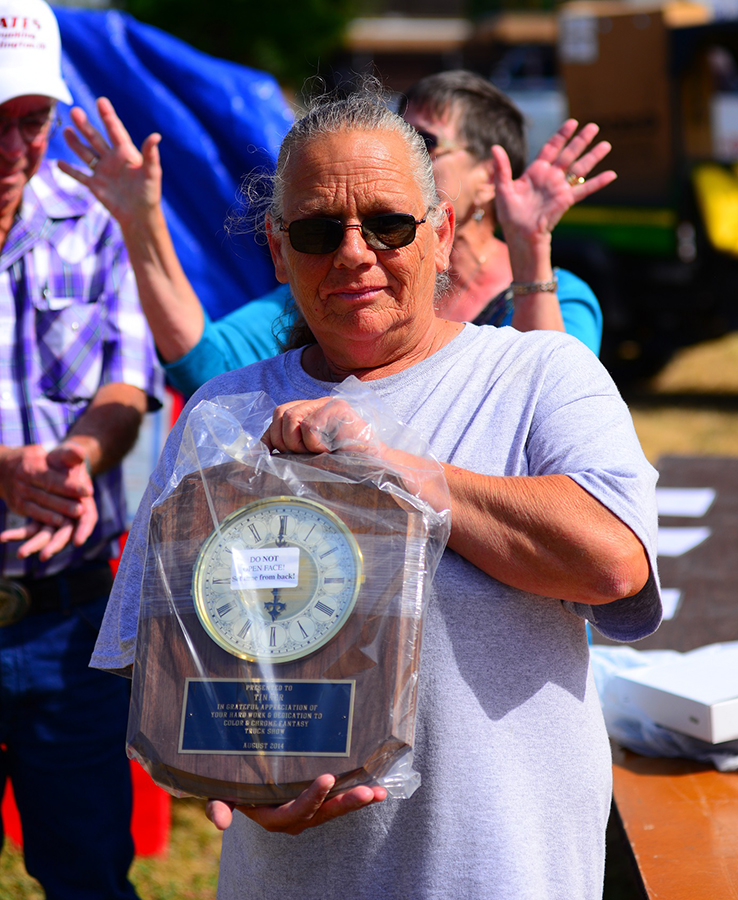 As a very special thanks, Ernie and Carol Bates had a photo album put together for Tinker showing the trucks and people who have attended over the past several years as the show has changed from the Chase County Fair Truck Show to the Color and Chrome Fantasy Truck Show. And what else would Tinker’s photo album be wrapped in but chrome? It was a fantastic and heart-warming moment of the show for Tinker to receive her album and personalized plaque.