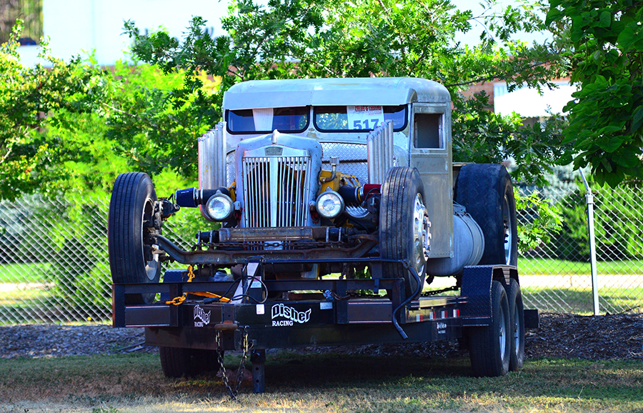 Hi-Plains Leasing of Commerce City, CO was in attendance with three of their trucks, including Counterfeit, their cool two-tone green W900B Kenworth, as well as one of their 4-axle Petes and a clean Western Star. Jimmy Disher brought the wild toys, though, including his 1952 Kenworth race truck and Low Buck$, the chopped-down, low-slung, hot-rod cabover. But, perhaps more popular than this was Jimmy’s recent project – an insane work of sheet-metal centered around a heavily-chopped and modified Peterbilt cab, the “truck” also features a White grille, an extended pickup bed, and a stance more akin to a salt-flat racer than a truck. Powered by an air-cooled Deutz V12 industrial engine with “organ pipe” headers, this rig certainly attracted a crowd – especially when he fired it up!