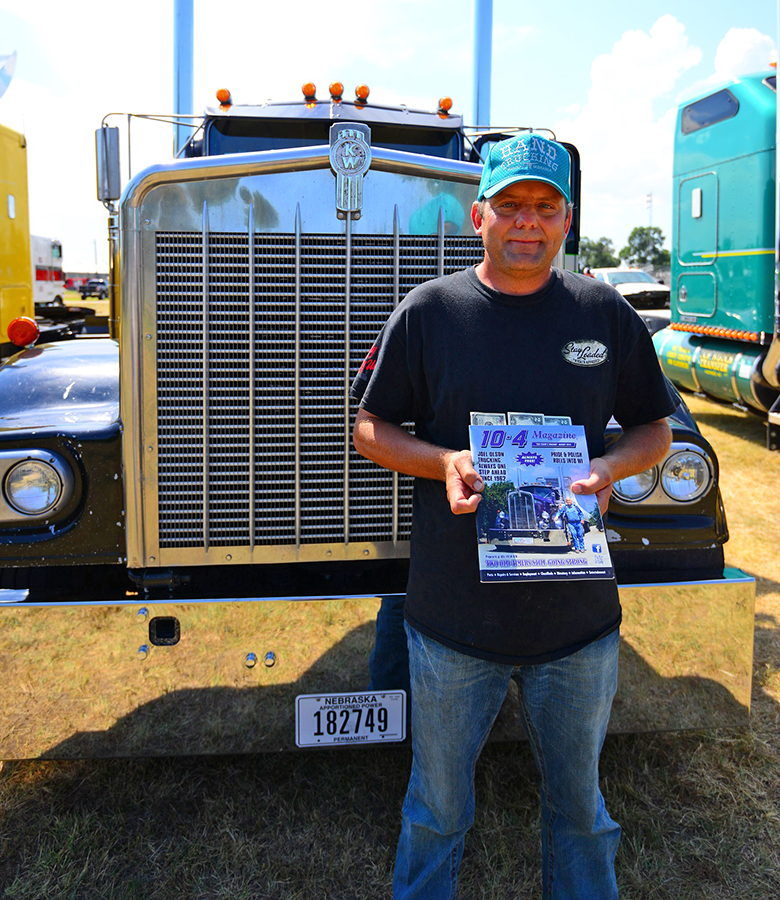 After the convoy it was time for some sleep before the awards and prizes Sunday morning. With temperatures finally cooling off (a little bit), Tinker handed out the Top 20 plaques and then everyone had their pick of great chrome prizes. The show may have shrunk a bit this year, but no one went home empty-handed. With cool donations from places like 4 State Trucks, PDI, Wilkins Oklahoma Truck Supply, Greybill and other companies and chrome shops, a great prize was had by all – from air-cleaner lights to train horns, seats, work lights, fenders and CBs, everyone had something to walk away with. We at 10-4 Magazine also awarded some “10-4 Bucks” ($104 cash) at the show. Though hard to choose favorites, it was Kevin Schnug and Hand Trucking that went home with the cash money tucked inside a magazine, this year.