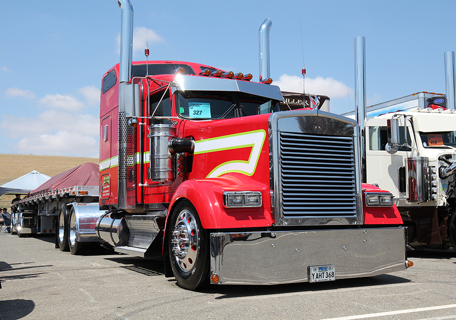 Some other trucks that were lookin’ extra good included Darrick Divine’s red 2009 W900L Kenworth with a white stripe, Moe Whitchurch’s green and yellow 2008 International 9900i, and Brady Jensen’s maroon 2008 Peterbilt 389 with three cream-colored stripes. Not to be outdone by anyone, Arlyn and Linda Workman’s red and black 1986 Peterbilt 359 was lookin’ great, as was Rudy Ceja’s maroon and black, super-slammed and super clean 1997 Peterbilt 379 and Ravens flatbed. Hands down, the best antique was the stunning turquoise 1980 Peterbilt 359 owned by Oldland Distributing out of Oregon, and the best heavy-haul truck was J&L’s red, black and blue “Contender” 2015 Pete 389 from Missouri.
