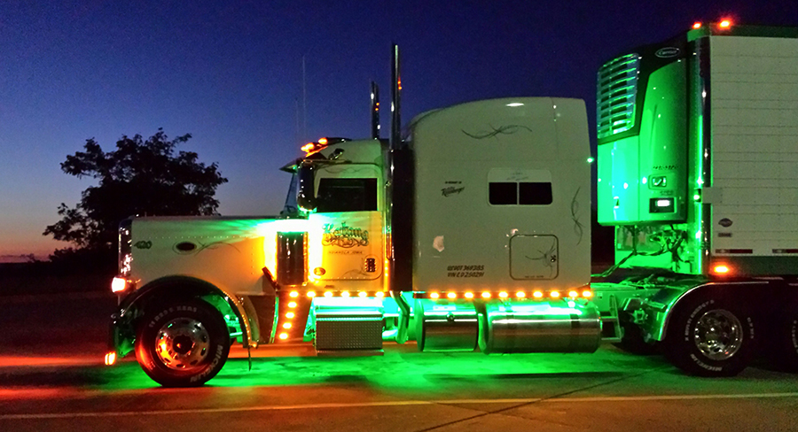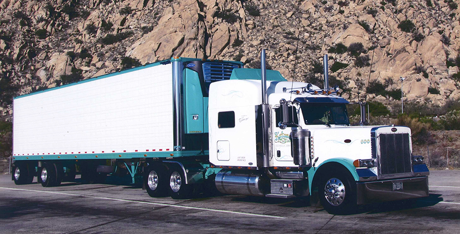Katana’s beautiful Caribbean Blue and white 379 and 389 Peterbilts pull 48’ spread-axle reefers. The Caribbean Blue has been a signature color for this family ever since Stephen picked it over 40 years ago. Today, that color graces the fenders, frames, whale tails, reefer units and rub rails of all their trucks, and it is also used for all of the old-school-style pinstriping. Their pride shines as bright as the green lights under Ernie’s truck and trailer!