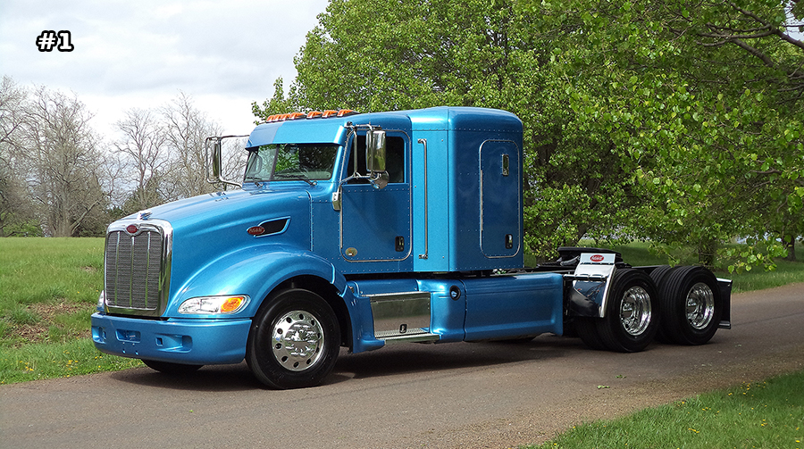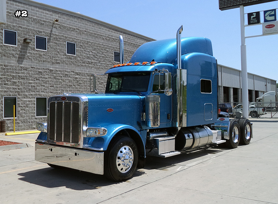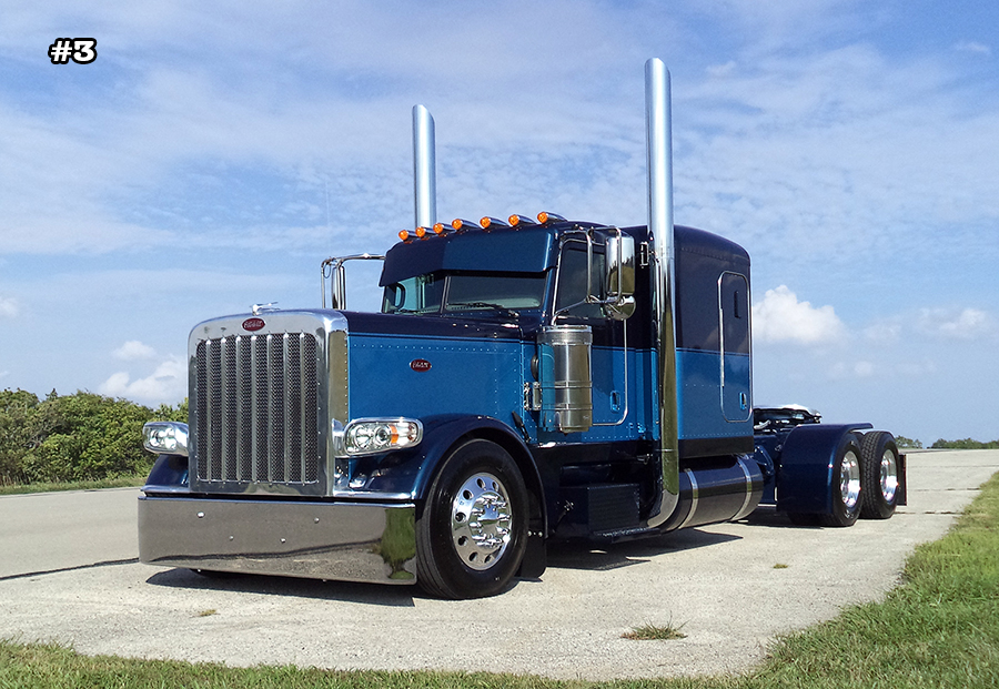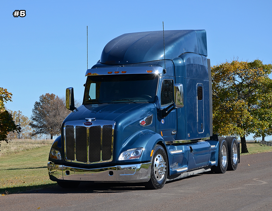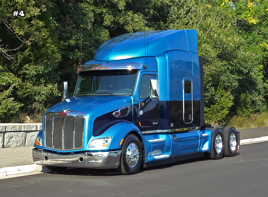 Over the years, Kevin has ordered several trucks from Clint. After ordering a few Peterbilt 386s (aerodynamic trucks), he found out that Peterbilt was going to stop making them in flattops, so he ordered one of the last 2015 Pete 386s with a 48-inch flattop (photo #1). He later added a nice fuel-efficient 389 with a 70-inch high-roof and the full aerodynamic package (photo #2), as well as two 75th Anniversary limited edition 579’s – the first one is #169 and it is two-tone blue (photo #4) and the second one, #246, is just solid dark blue (photo #5), but super-cool nonetheless.