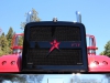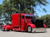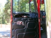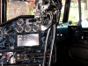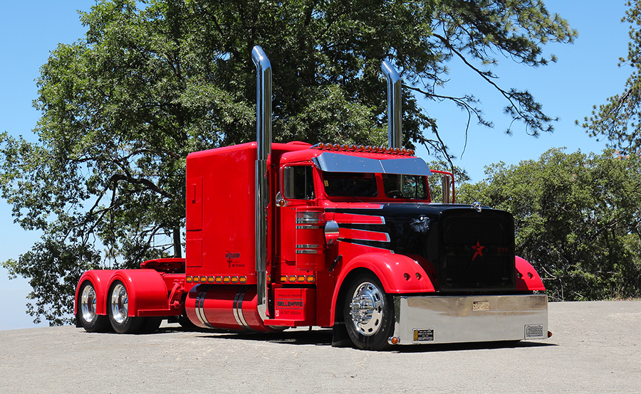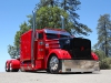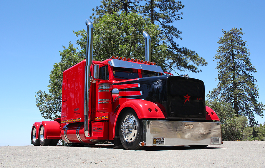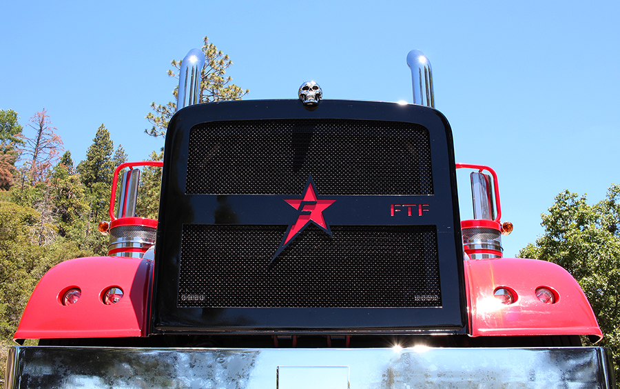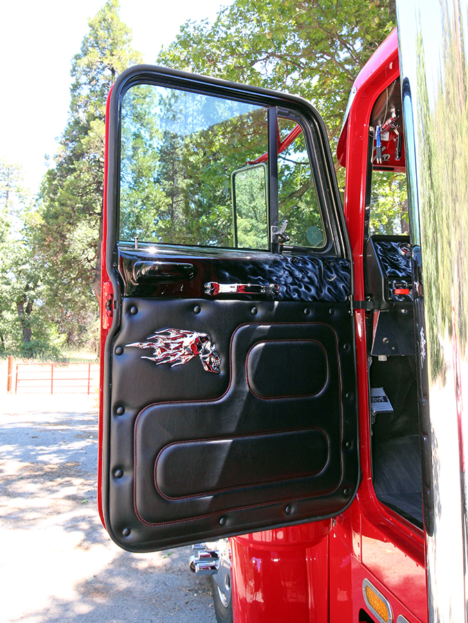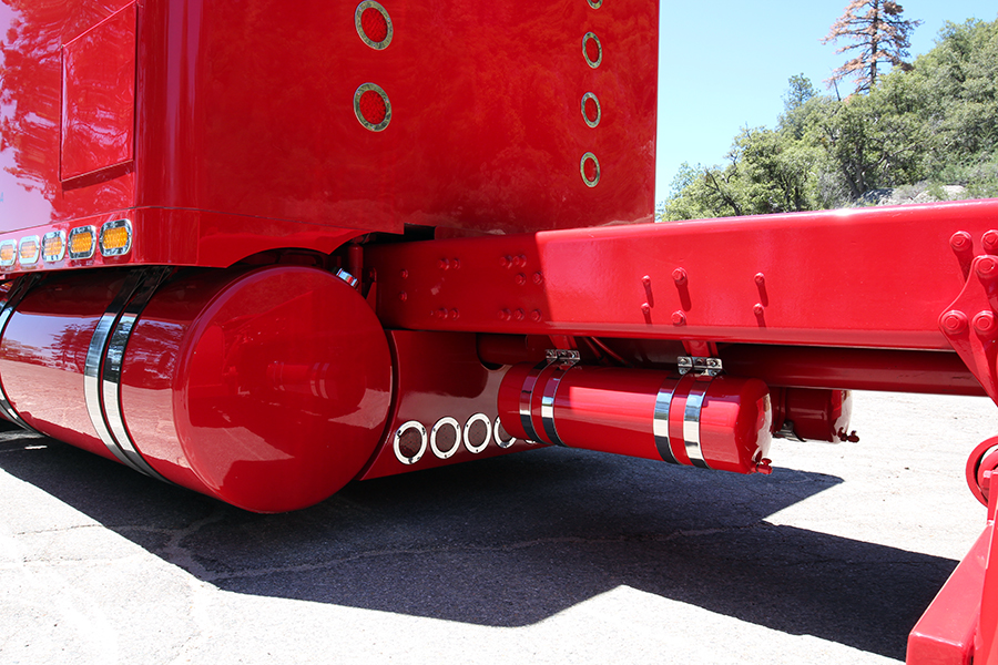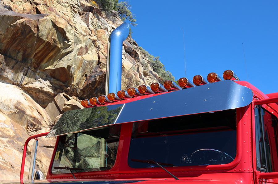 In 2012 he repainted the frame, and then in the winter of 2013, he repainted the entire truck (except for the blue scallops – those were still in good shape so they taped them off and kept them). During this rebuild, he also stretched his front fenders down another five inches to line-up with his battery boxes, had custom mirror brackets made, he painted the breathers, and he completely tore apart and re-skinned the sleeper, which was originally just glued together, but this time he welded everything. He also repositioned his cab lights four inches forward, re-skinned his doors and removed the exposed rivets, added an “I” Panel between his fuel tanks, and switched out his 7-inch pipes with 8-inchers. Finally, he added custom, retractable strobe lights to the top of his sleeper that disappear into a hidden compartment at the flip of a switch!