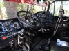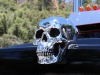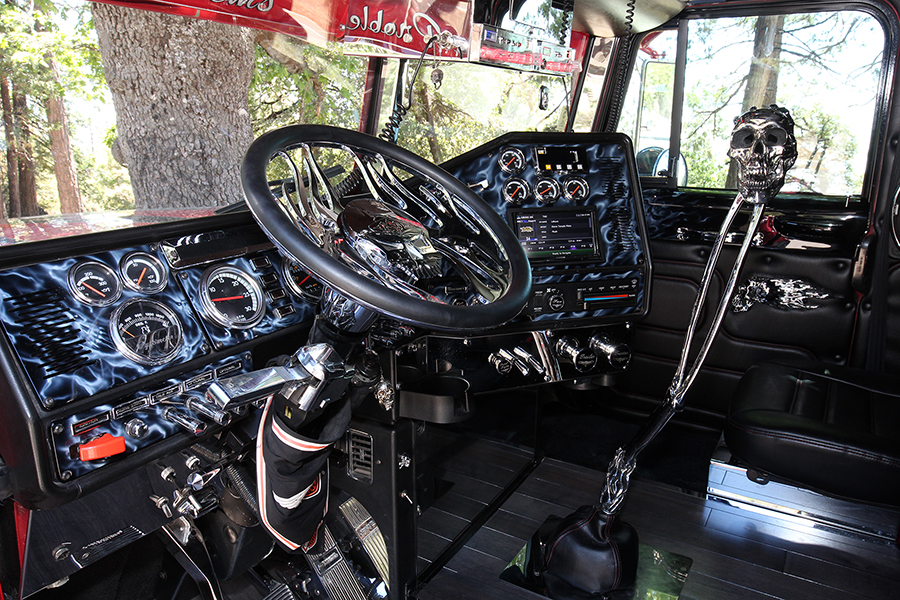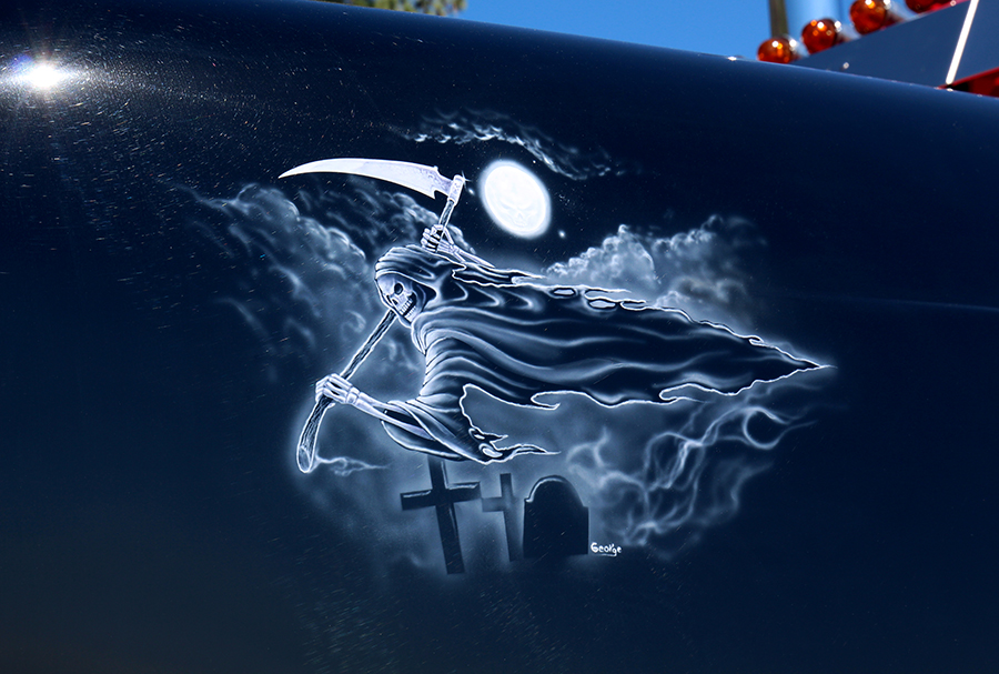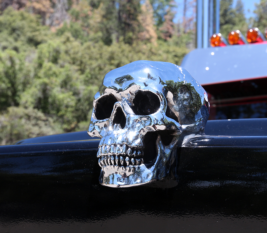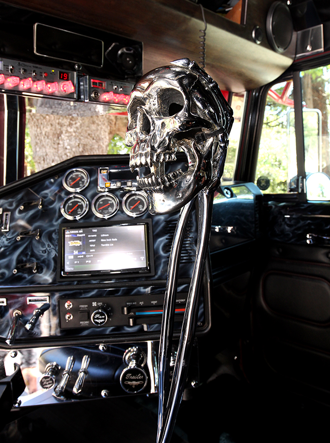The following winter, and throughout the early part of 2015, he performed one more round of customization. Wanting to get rid of his now-boring louvered grille, he designed and built a completely custom wire-mesh grille. Thinking that it would look good painted, but not blue, he decided to go with black, which meant repainting the scallops on his hood. At this point, he did some more inside, as well. Repainting all of the dash panels black and then having them sprayed with murals of smoke and skulls, he also had everything reupholstered in black leather with red stitching, had custom aluminum pieces made for the armrests and door pulls, stained his wood floor black, and installed a completely-custom, hand-made, skull/skeleton shifter and knob.