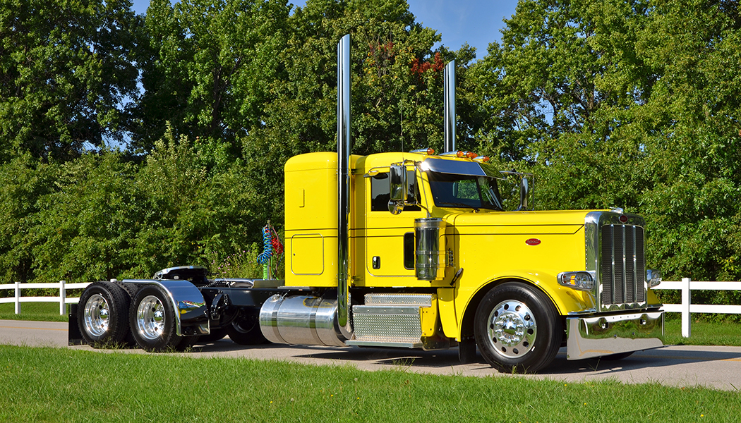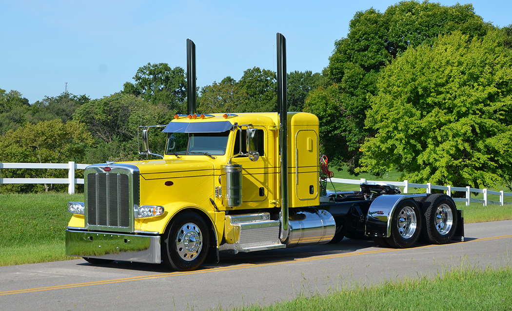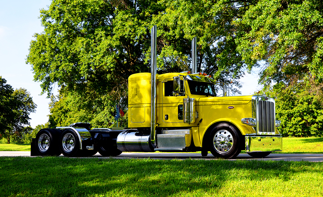 Leon’s new truck is a 2016 Pete 389 long hood with a 36-inch flattop sleeper, an ISX Cummins with an 18-speed transmission, a 270-inch wheelbase, full locking differentials, Low-Air suspension, a Platinum interior package and all the goodies. This truck was not ordered by Leon – it was a stock custom truck that Clint had ordered for the lot, but Leon said it was like he had ordered it for him, as it had everything he wanted (he didn’t think he wanted a yellow truck, but now he loves it).