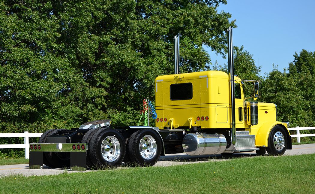 After graduating high school, he immediately took his driving test, earned his CDL, became an owner operator, and then hit the road in a black 1999 Peterbilt 379 short hood he bought from his dad. This cool truck had a 70-inch Ultra sleeper, a turned-up 3406-E Cat (from 475 to 550) hooked to a Super-10 transmission, a painted drop visor, a custom rear light bar, polished aluminum half-fenders, and HID headlights. Leon ran that truck until July of 2013, when he traded it in for an all-white 2010 Peterbilt 389 from Clint. This rig, which had a 70-inch high roof sleeper and an ISX Cummins, was loaded! Leon ran that truck until his dad sold his 2008 Freightliner Cascadia a few weeks ago, so Leon passed the white one to him and upgraded his ride to the bright yellow one seen here.