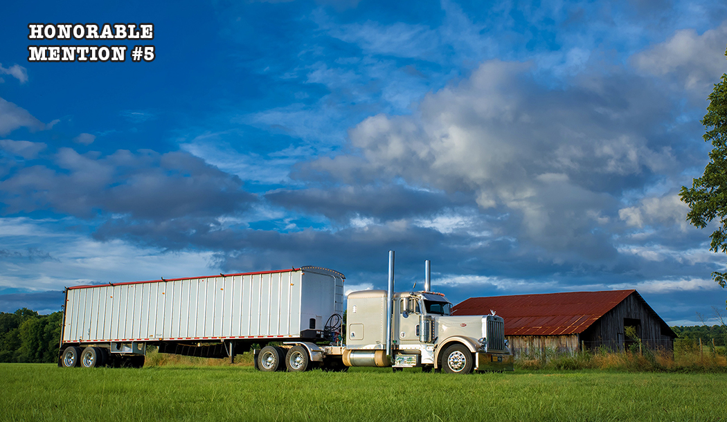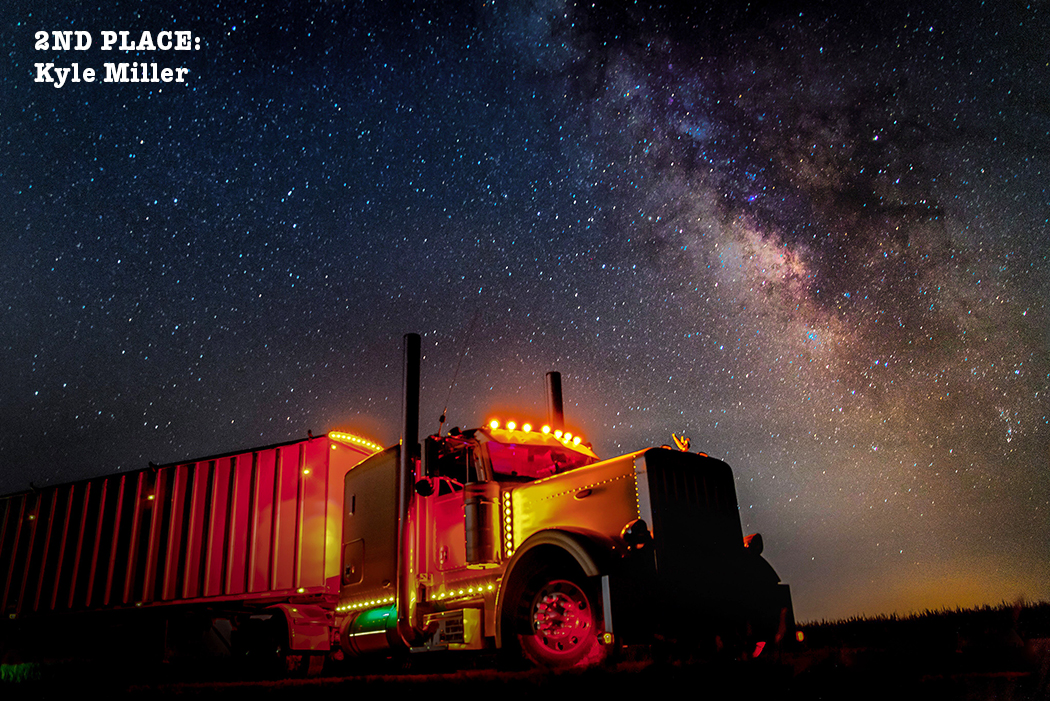 The 2nd Place winner was Kyle Miller of Nashville, AR. Kyle took this technical shot at midnight last summer in McGehee, AR right after unloading a load of chicken litter out between the rice fields. He didn’t have a tripod with him, so he found an empty snack cracker box and a piece of shop towel and propped up his camera with it for this 20-second exposure. This is a single exposure shot, and in order to get his truck lights on without overexposing them, he had to open the shutter to start taking the picture and then run through the frame and, very quickly, flick his lights on and then right back off. He chose to submit this picture because there’s so many truckers out there burning that midnight oil that don’t realize the beauty that is right outside. If they only took a moment to stop and see it, they would be amazed. And, you just never really see big rigs shot under a blanket of stars and the Milky Way! Kyle (26) is an owner operator who runs the 2000 Pete 379 in the photo, and he always has his camera with him on the passenger seat of the truck. His winnings include a 10-4 sweatshirt and t-shirt, as well as a free one-year subscription.