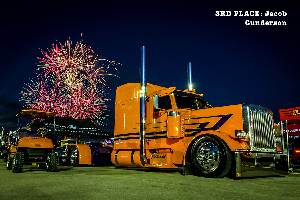 3rd Place was awarded to Jacob Gunderson of Oconomowoc, WI. Jacob had the opportunity to capture this image during the grand finale of the fireworks display at the Walcott Truckers Jamboree in 2017. After running around and trying to find the perfect spot, at the last second, he set up near the Dynaflex booth, and was able to capture this great picture. He only wishes he could have got the truck lights turned on in time for the photo. Jacob (22) works for Steve Moss, helping him around the shop with the trucks, but his real passion is photography.