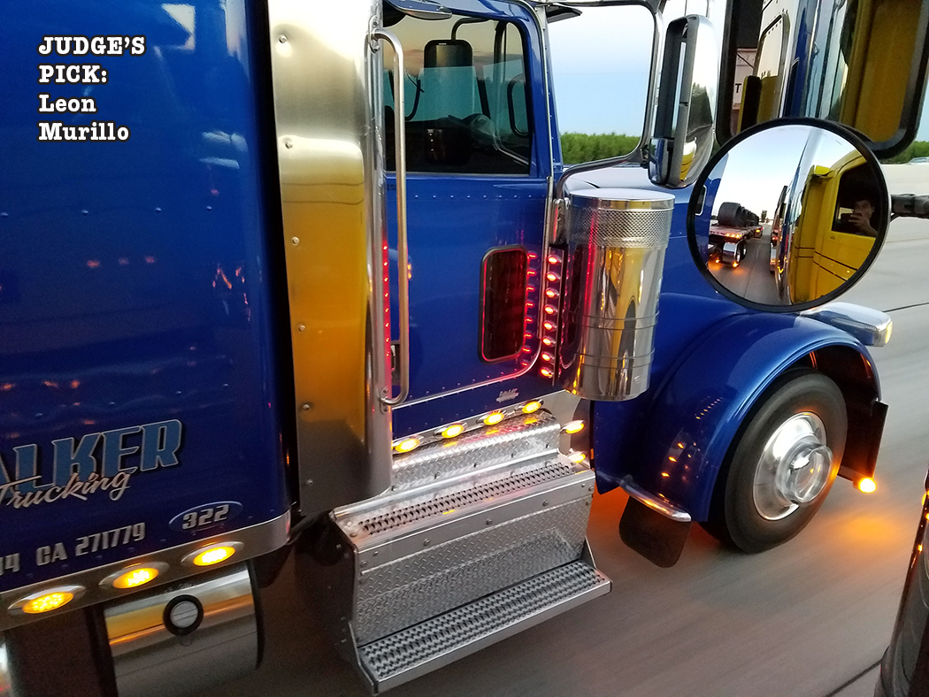 Dan’s pick went to Leon Murillo of Porterville, CA. Leon takes all his road shots with his Samsung Galaxy S7 phone. He took this rolling shot of Ron Walker’s blue Peterbilt on Hwy. 99 in California between Goshen and Traver early one morning. Dan liked this shot because it captured so many things – the blue truck rolling, the truck’s trailer and load (in the mirror), and Leon himself, taking the picture, along with his yellow truck (also in the mirror). One quick shot that captured so many elements! Not always easy, from a photographer’s standpoint. Leon is an owner operator from California who is famous for the rolling “road shots” he takes and posts on Facebook and Instagram.