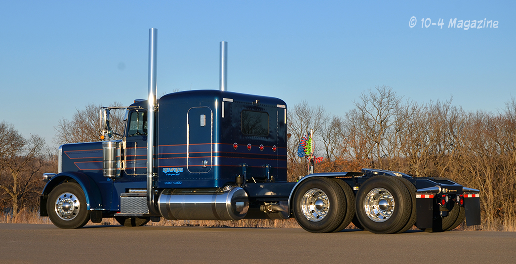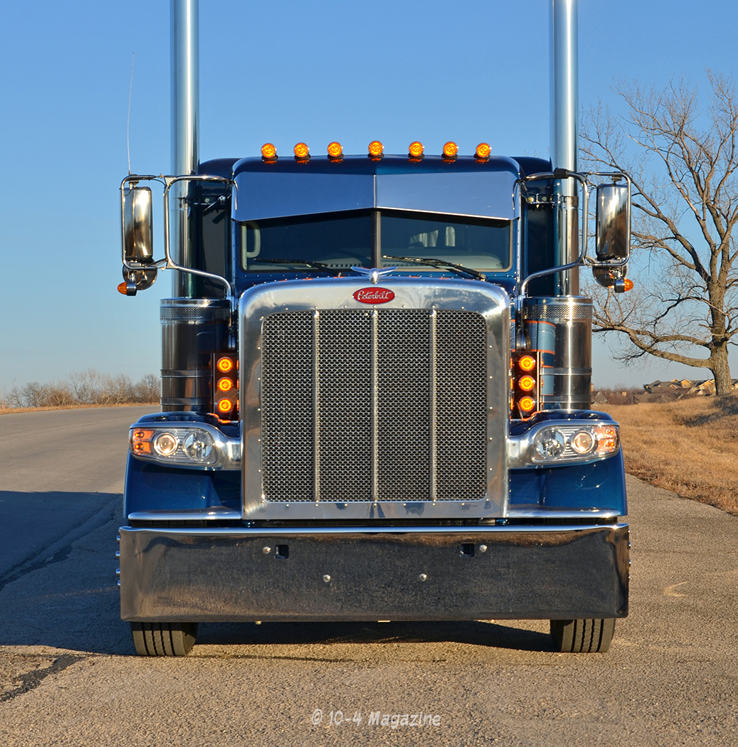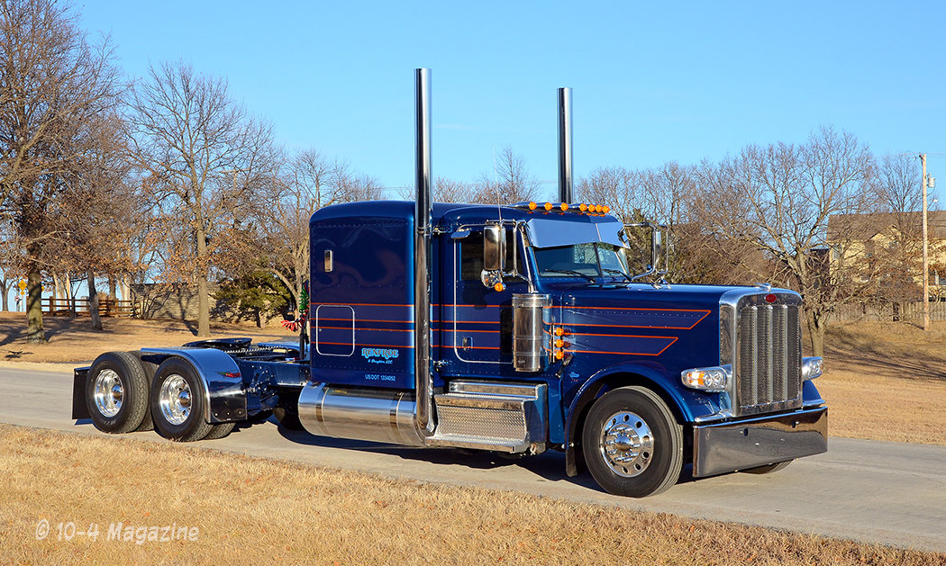 Wanting the new truck to match the family colors, we ordered it in blue. The truck is a 2018 Pete 389 flattop with a 280-inch wheelbase on Low Low Air, a 565-hp Cummins X15, an 18-speed with 2,050 lb. ft. of torque, and loaded with all the good stuff, including a Platinum interior and a long slide 5th wheel, so he could pull some single-axle trailers, too.