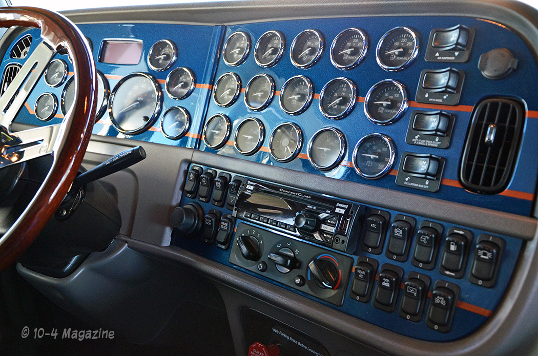 When the truck showed up, Tyler in our service department moved the DPF to make room for some dummy pipes. After that, the body shop guys tackled the rest by hiding the DEF tank and then adding a Texas bumper, dummy stacks, a drop visor, seven bullet lights, breather lights, painted cab and sleeper skirts, low seat bases, stainless Hogebuilt half-fenders on hidden brackets and a nice wood steering wheel. Pat in our body shop laid out and painted some stripes in Robby’s colors and scheme down the sides and around the back. We chose to go straight with the stripes, instead of following the huck row, like we normally do. Then, Pat and I laid out and painted matching stripes, like the exterior, on the dash panels, as well.