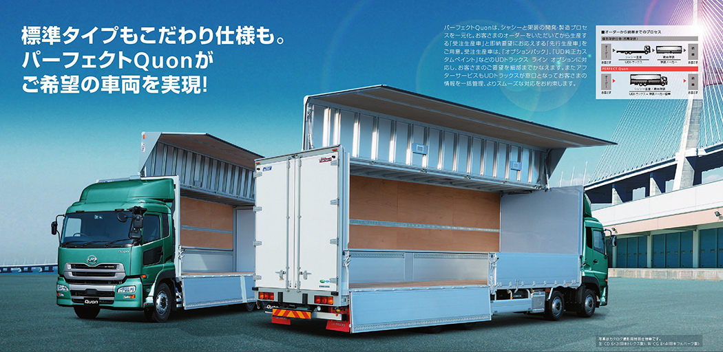 Most of the trucks in Japan are either eight- or six-wheelers. They run on wheels with eight lugs and are mostly rated at between 21 and 25 tons GVW (the heavier rated types of trucks have ten lugs). The eight-wheelers, at first glance, look like closely-coupled tractors and semi-trailers, but on closer inspection, the trucks are bobtails, and most of them have “gull wing” bodies. These types of bodies have drop sides, about a third of the way up, and the rest opens up, via hydraulic rams, front and rear. The picture of the UD sales brochure paints a more vivid picture than words can accomplish.