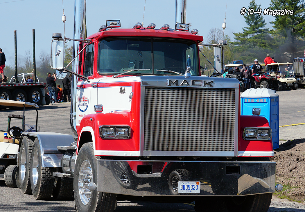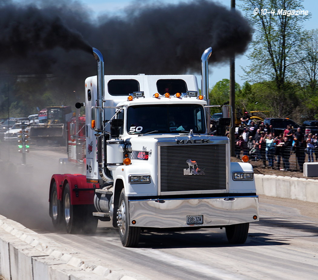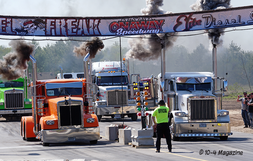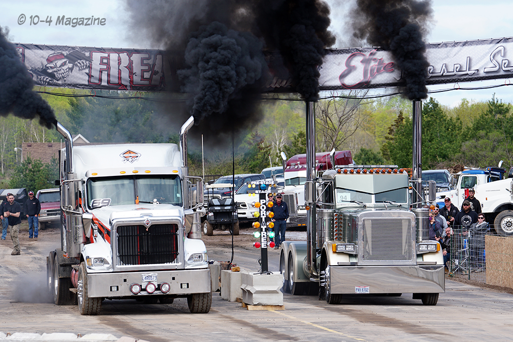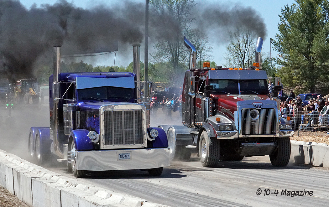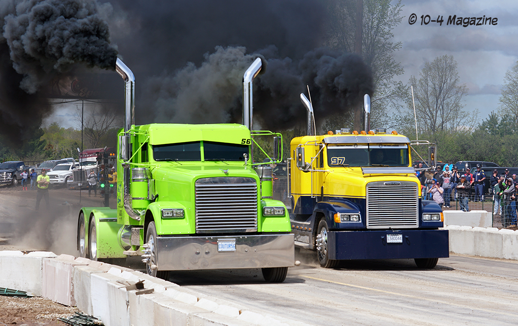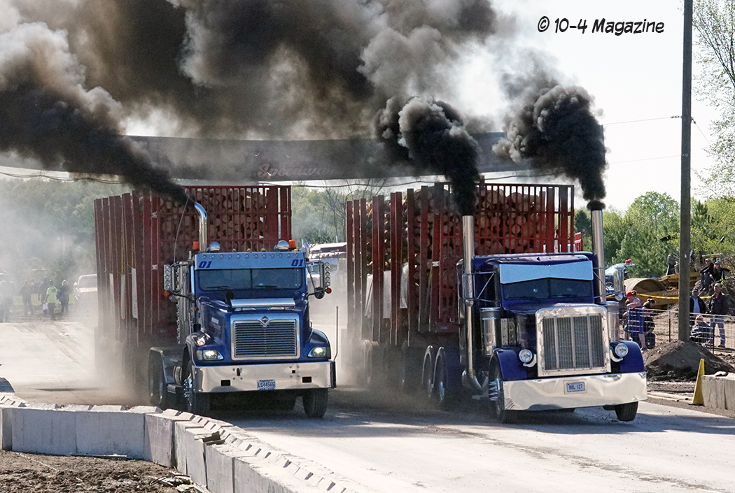 Friday was a beautiful day, and bobtail trucks were allowed to make practice runs from 2:00 pm to 7:00 pm. Prior to the practice runs, I was able to catch a small convoy heading up to Onaway consisting of Wade LaLone of Diesel Freak and his well-known “Foolish Pleasure” Kenworth W900, along with Curt LaLone, owner of MLT Transport out of Mt. Pleasant, MI with his 2002 Peterbilt 379, Michael Ostetrico of MO Power/MO Haulers and Recovery out of Aurora, OH driving his Kenworth W900 pulling his trailer loaded with his Peterbilt 379 daycab race truck, and Mario Monette (Mario High Performance Diesel) out of Edmonton, Alberta in his Kenworth W900 pulling his enclosed trailer (which was hiding his Peterbilt 379 race truck inside).