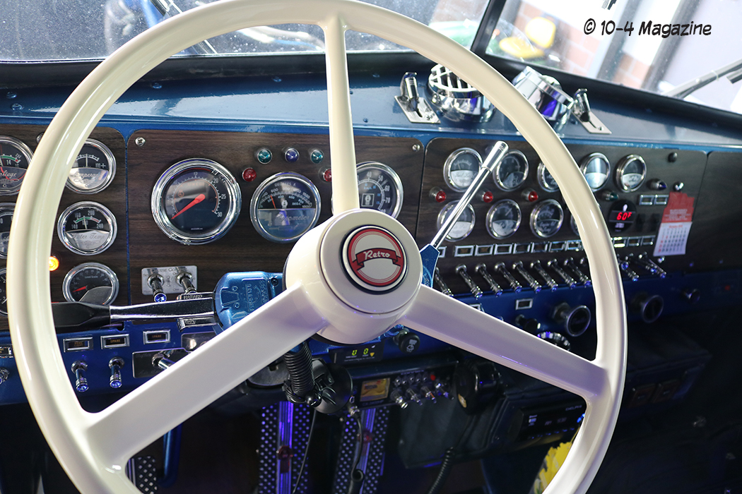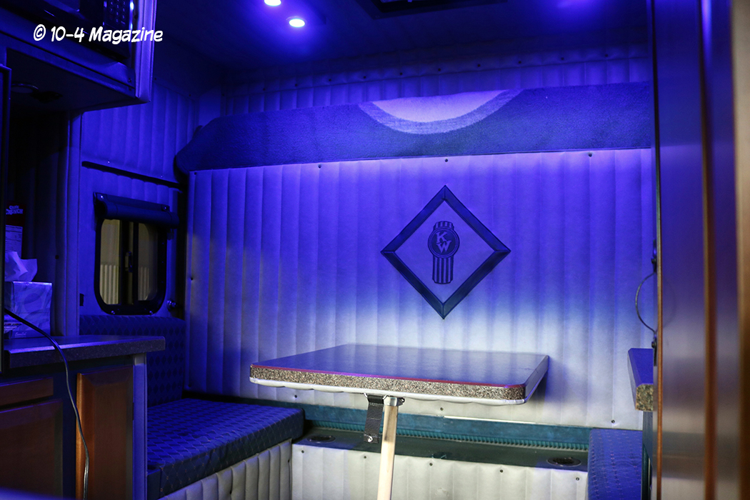 Pittsburgh Power exhaust manifold, our high-capacity radiator, a FASS fuel system and a Spinner oil centrifuge. The truck has a 13-speed transmission, 3:36 gears, a 285” wheelbase, and the cab and sleeper are mounted on a sub-frame, which is all on air-ride. It has an 84” Aerostar sleeper with a custom interior, a refrigerator and microwave, a sink and porta-potty, a bed that folds-up for a table, a central vacuum system, and a 3,000-watt inverter and APU. His very talented wife hand-stitched the Kenworth logo into the sleeper cab wall and made a matching quilt for the bunk. The cab interior is all new, and it has new steel frame rails, wiring, airlines and brakes.