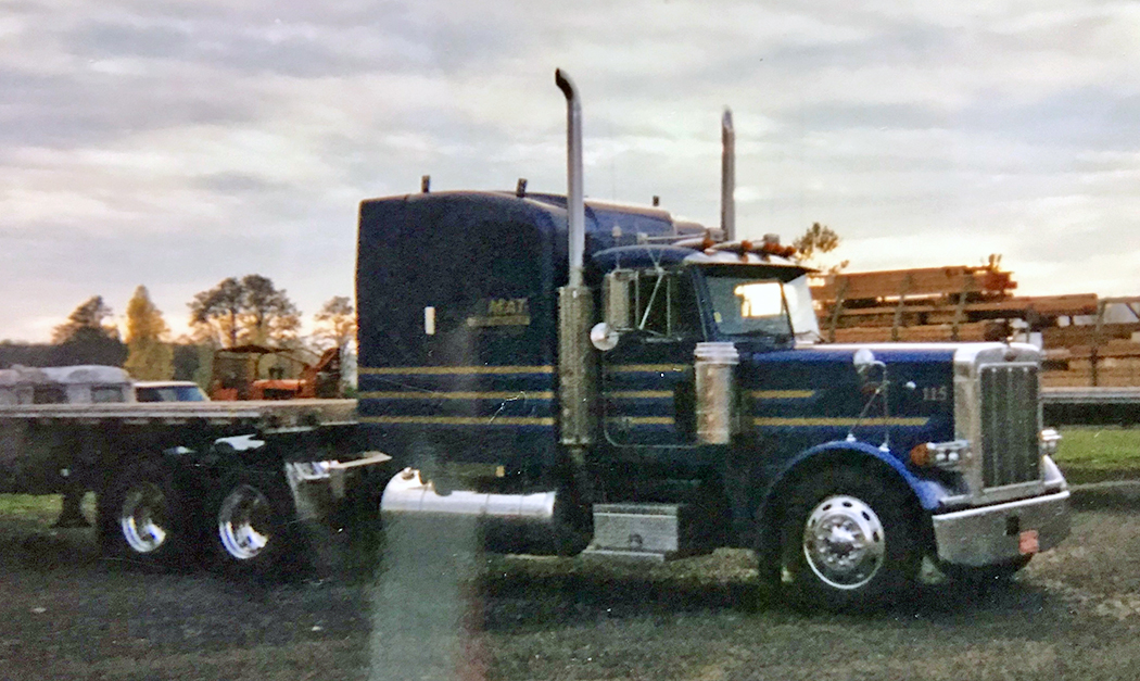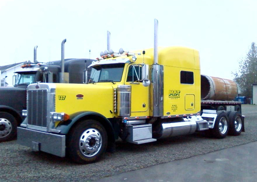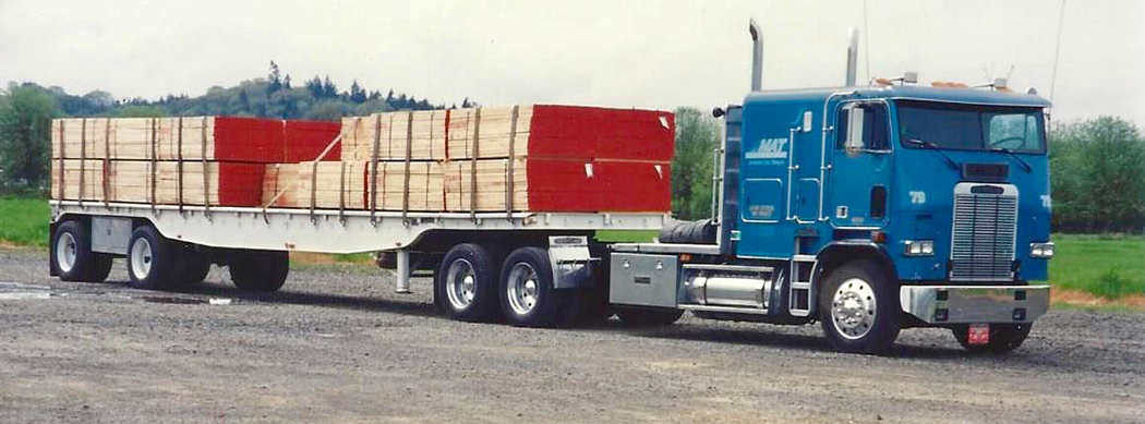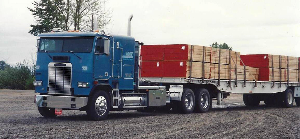 By the late 80s the trucking industry proved to be where Patty wanted to try her own hand at entrepreneurism, and that is exactly what she did, along with her then-husband, in 1988, when they formed MAT Transportation. Starting out with less than a handful of used cabovers, including a yellow Peterbilt 352, all of them were spec’d with long wheelbases for hauling long materials such as laminated beams, as well as many other commodities. Patty based her office and shop just west of Junction City, Oregon, on several acres along Highway 36, and this was also where she lived. Her office was a single-wide trailer, and the shop was a single-bay metal building. Her house was a small modular home, and Patty was more than happy with all of it!