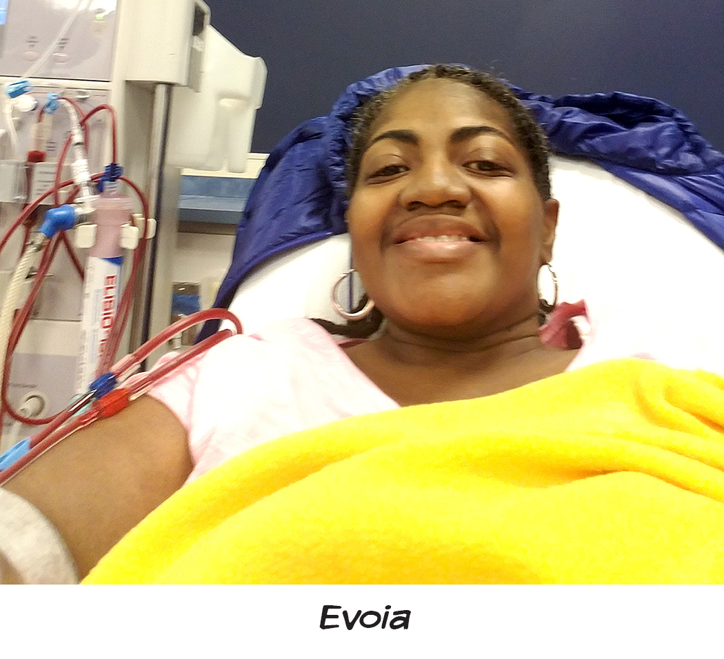 There are two types of dialysis for kidney failure – Peritoneal, where the inside lining of your own belly acts as a natural filter, and Hemodialysis, where your blood is pumped out of your body through an artificial kidney machine and then returned to your body by tubes that connect you to the machine. Evoia opted for the Hemodialysis. Using your veins gives you a better cleanse, and she has the option to do this procedure at home. She can do her dialysis for a few hours each night before she goes to sleep. The other option would have required her to go to a facility and be hooked to a special machine for 4 hours, 3 days a week.