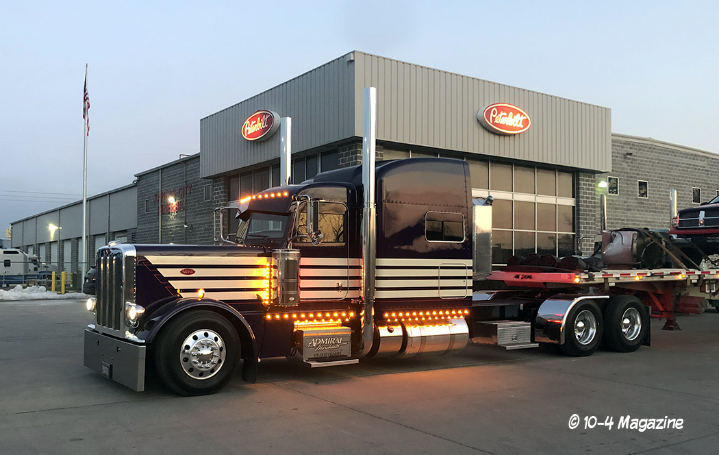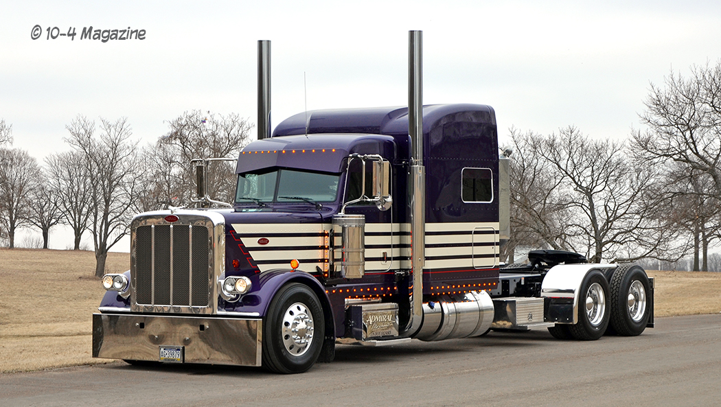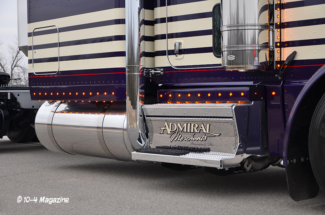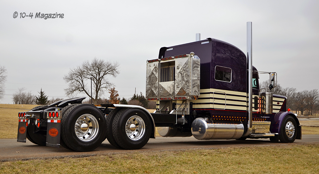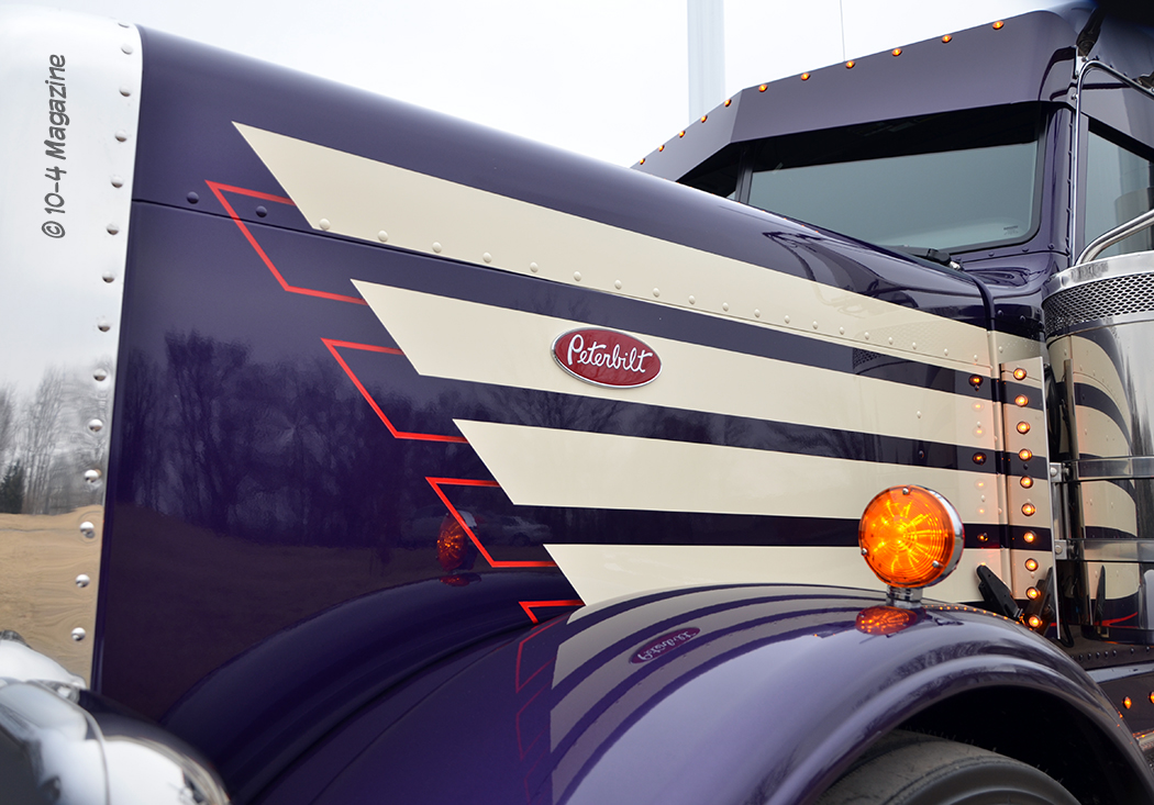 The new truck is a 2019 Peterbilt 389 with a 78” HR sleeper, a long wheelbase, a Cummins X15 with 2,050 torque and an 18-speed, painted Spectra Master Purple with a black frame. When the truck showed up, Billy in the body shop took care of all the lights and goodies Mark wanted, while Tyler in service got the new 7-inch straight pipes installed. Mark knew he wanted stripes, but I decided to throw a wrench into the design and add some small red accents, as well. All he said was, “Okay. I guess I trust ya!” In the end, I think we both liked how it turned out.